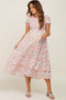 A sleeveless textured dot maternity maxi dress featuring adjustable cami straps, a smocked top, a ruffle hem and a square neckline. Skirt is double lined.