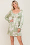 Black floral dress with a rounded neckline, a smocked bodice, long sleeves, and a back keyhole button closure. Skirt is lined.