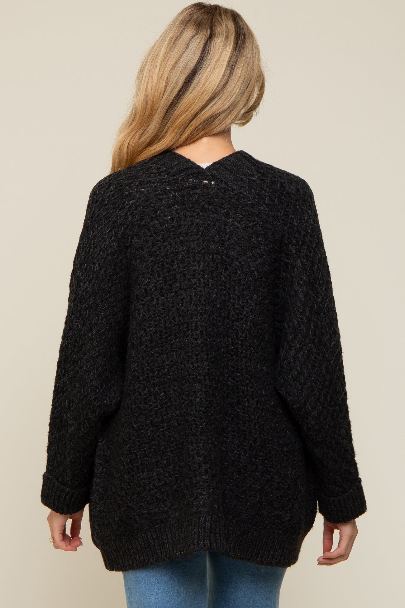 A knit maternity cardigan featuring long cuffed sleeves and an open front.