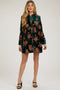 A solid maternity mini sweater dress with a collared neckline and puffed long sleeves.