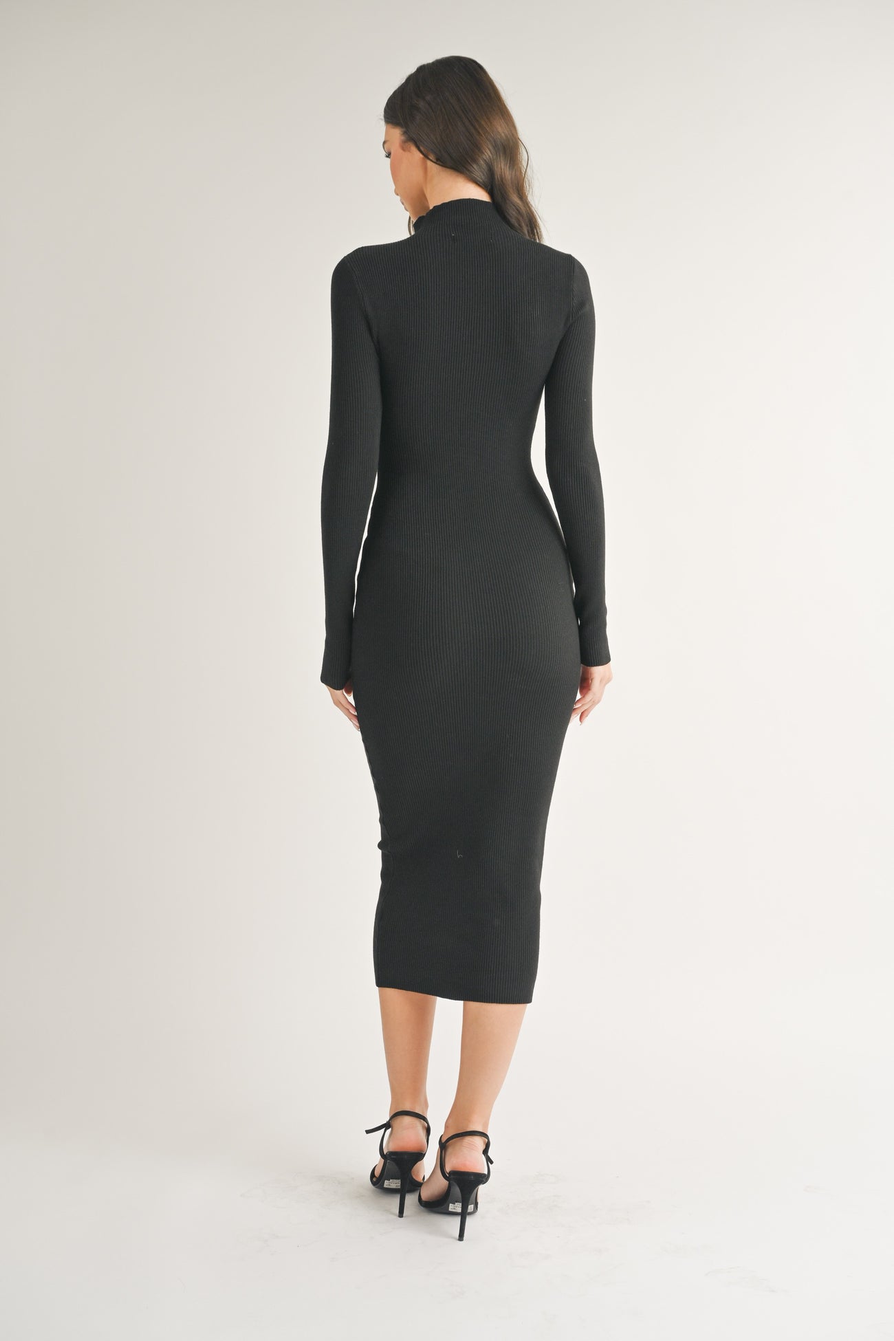 A ribbed, fitted midi dress featuring a mock neckline and long sleeves.