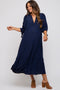 A knit maternity midi dress featuring an off shoulder neckline, long dolman sleeves and a back slit.