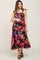 A printed maternity midi dress with a smocked bodice, adjustable self tie straps, and ruffle trim. Dress is partially lined.