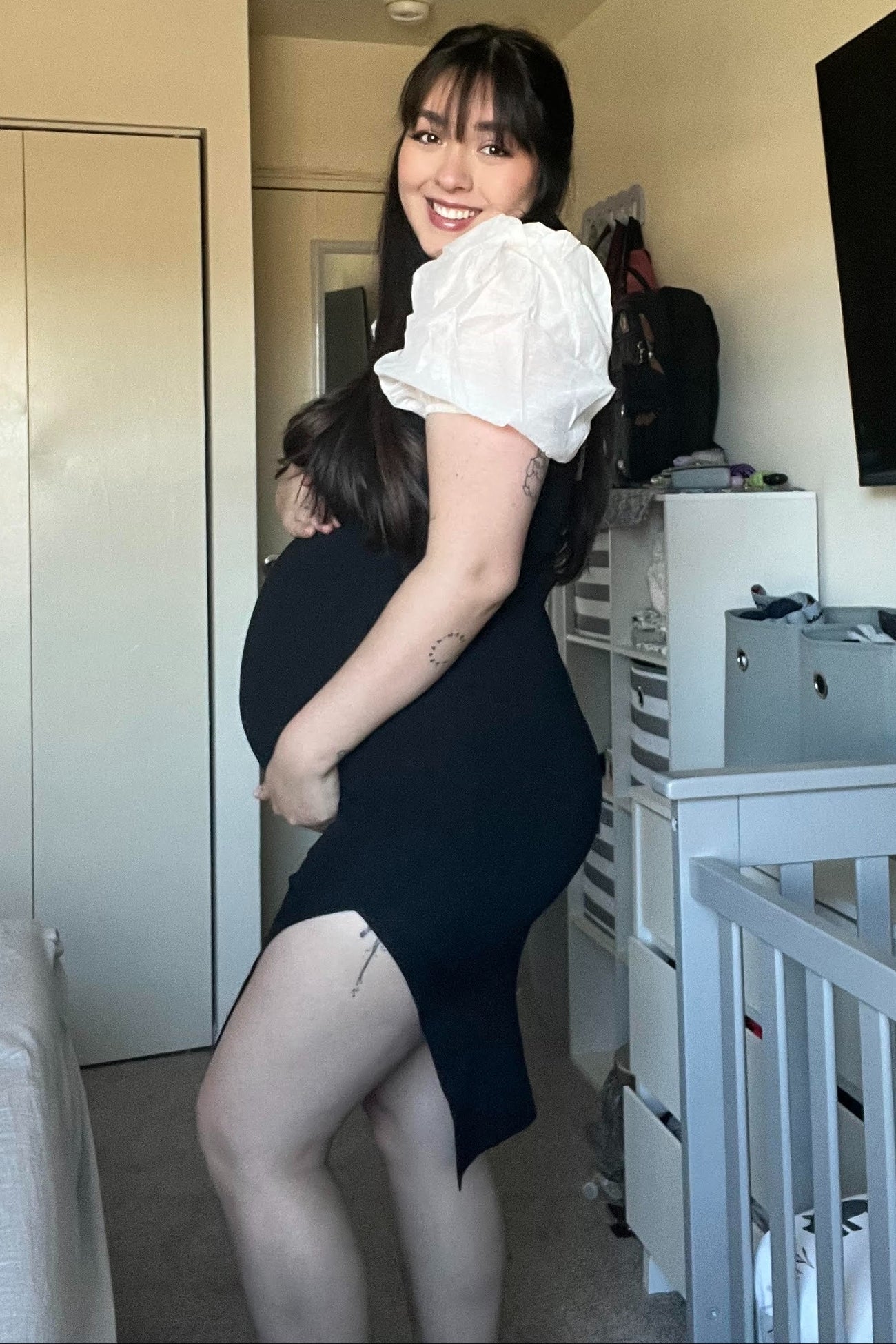 A ribbed maternity midi dress with a squared neckline, sheer puff sleeves, and a side slit.