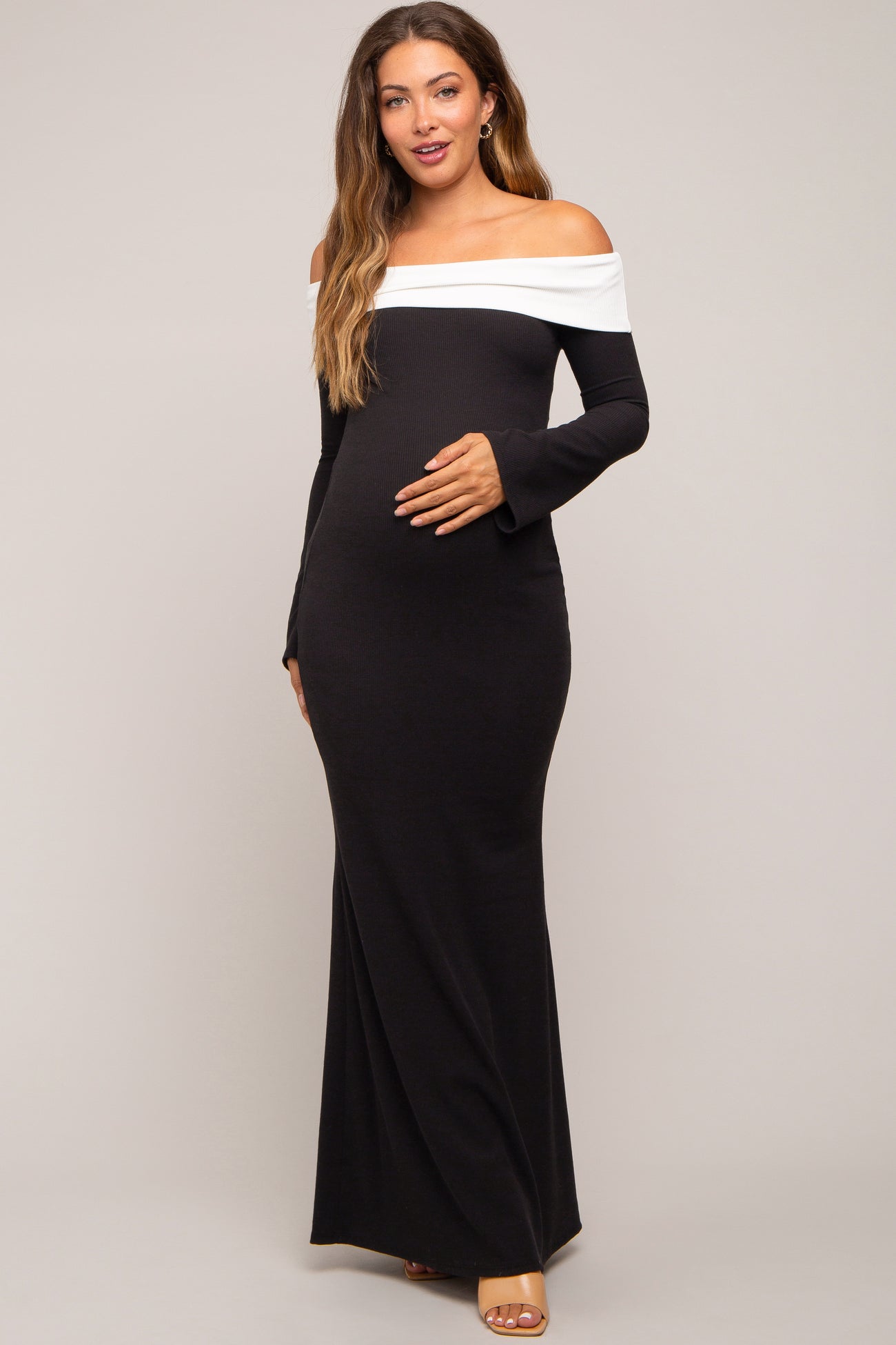 Black Ribbed Knit Colorblock Long Sleeve Off Shoulder Maternity Gown