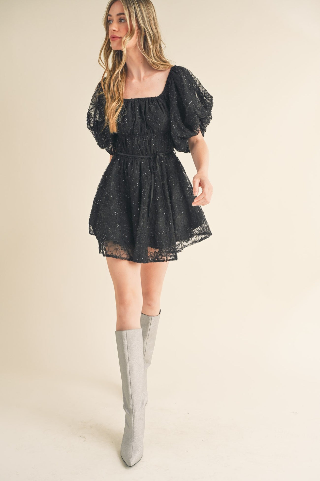 Black Sequined Lace Flared Mini Dress