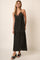 A solid sleeveless maxi dress featuring adjustable cami straps, lace accents, back buttons, a back zipper closure and a v-neckline.