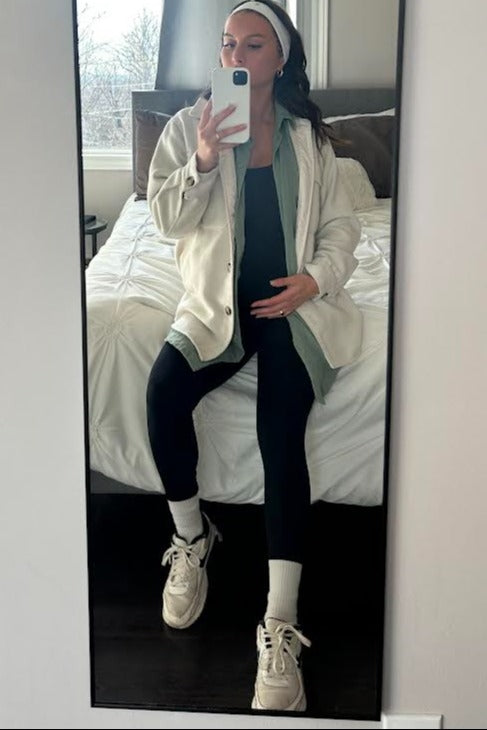 A solid sleeveless maternity one piece. Fitted.