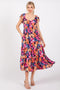 A sleeveless maxi dress featuring self-tie colorblock shoulder straps, a smocked top, a tiered skirt, side pockets and a square neckline.
