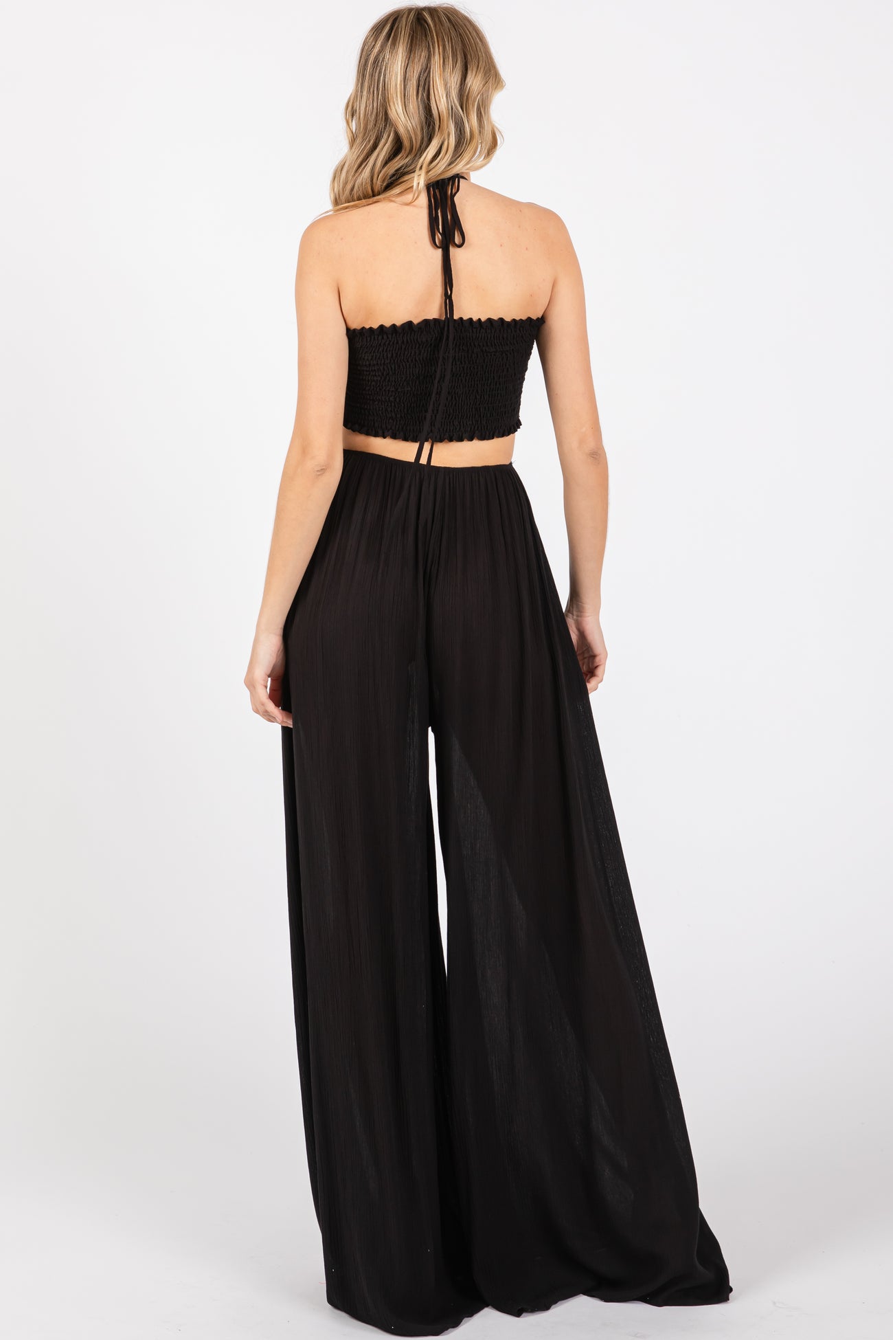Black Smocked Drawstring Halter Side Cutout Jumpsuit
