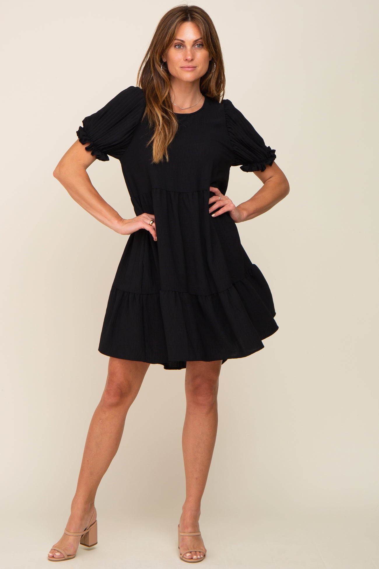 A solid hued dress featuring pleated puff sleeves, a tiered skirt, a ruffle hem, side pockets, a rounded neckline and a back keyhole cutout with a button closure.