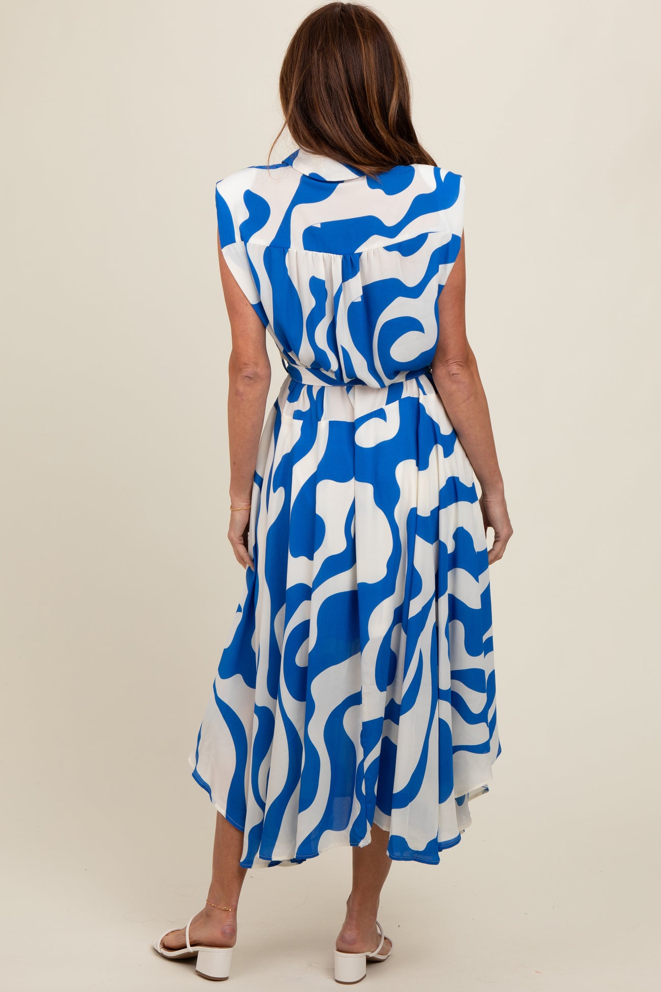 Blue Abstract Print Collared Belted Dress