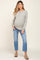 A pair of medium wash maternity straight leg jeans with an open knee detail, distressing, five pockets and full panel elastic bellyband. Material has little stretch.