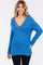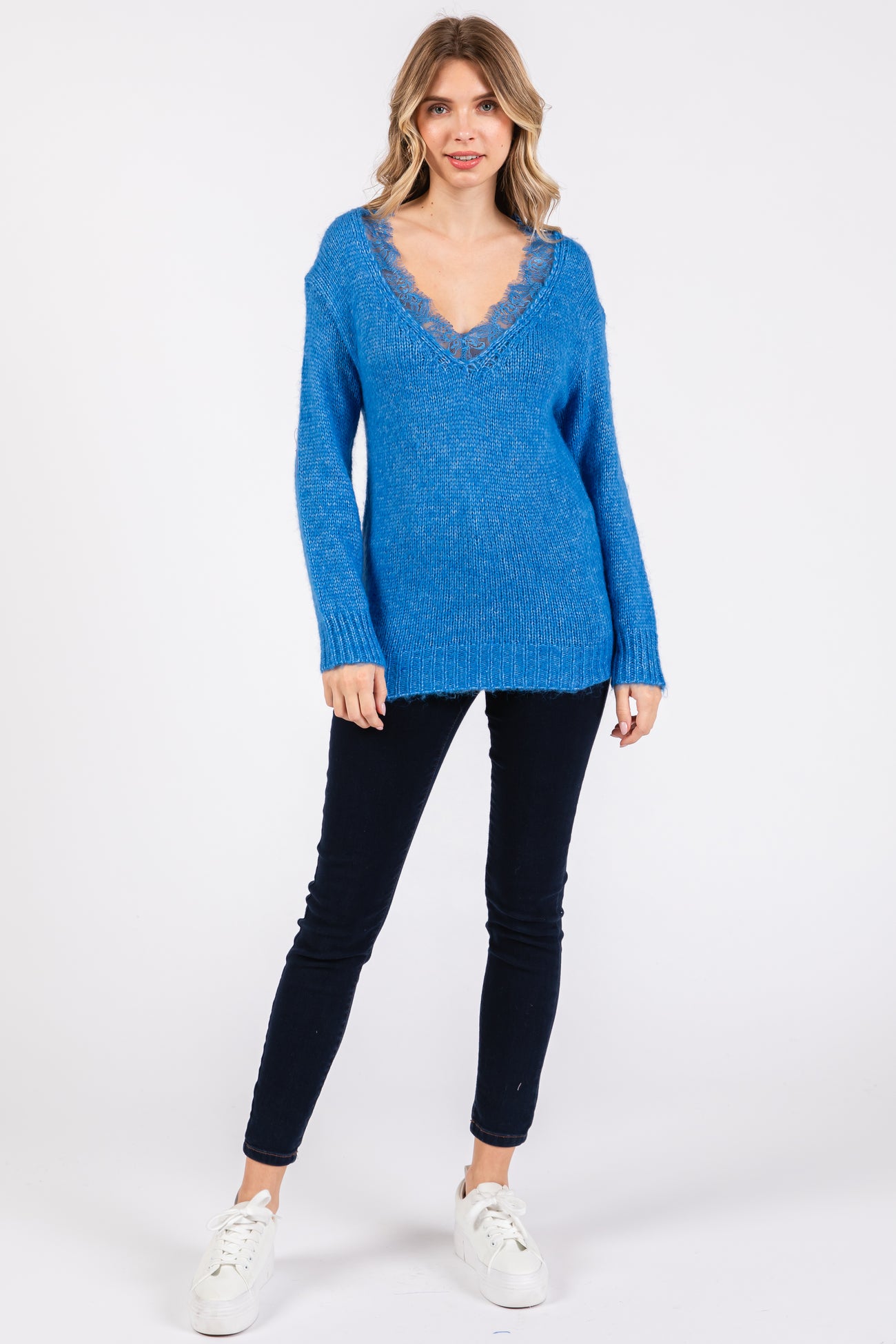 A sweater featuring a v-neckline with lace trim and long sleeves.