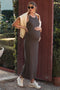 A knit maternity top featuring exposed stitching, long sleeves, a curved hem and a v-neckline.