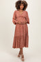 A multi-color tropical print maternity dress featuring short puff sleeves, side pockets, a smocked top, a ruffle hem and a v-neckline.