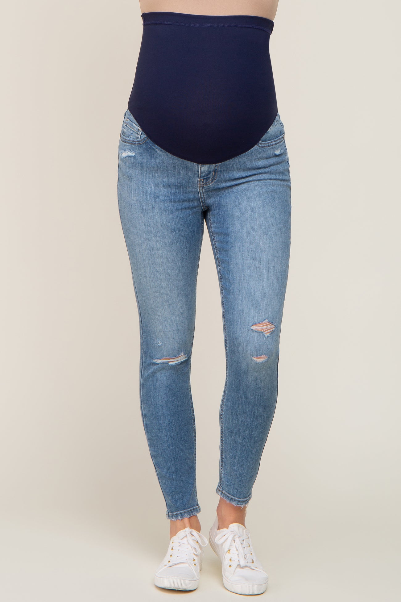 A pair of medium wash maternity skinny jeans with slight distressing and an open knee detail. five pockets and full panel elastic bellyband. Material has medium stretch.