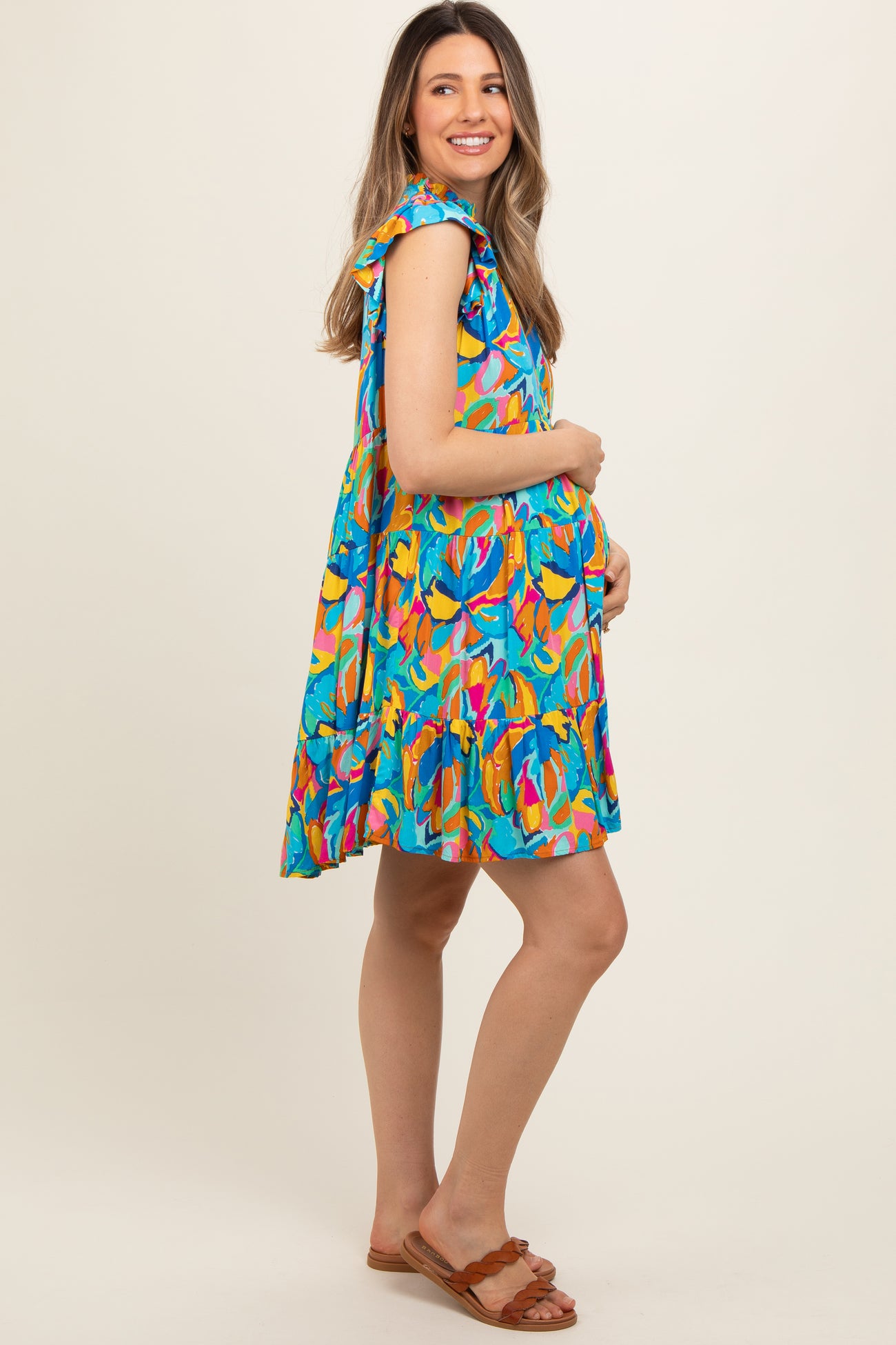 A printed maternity dress with a v-neckline, a front neck tie, ruched shoulder accents, ruffle accent cap sleeves, and a tiered skirt.