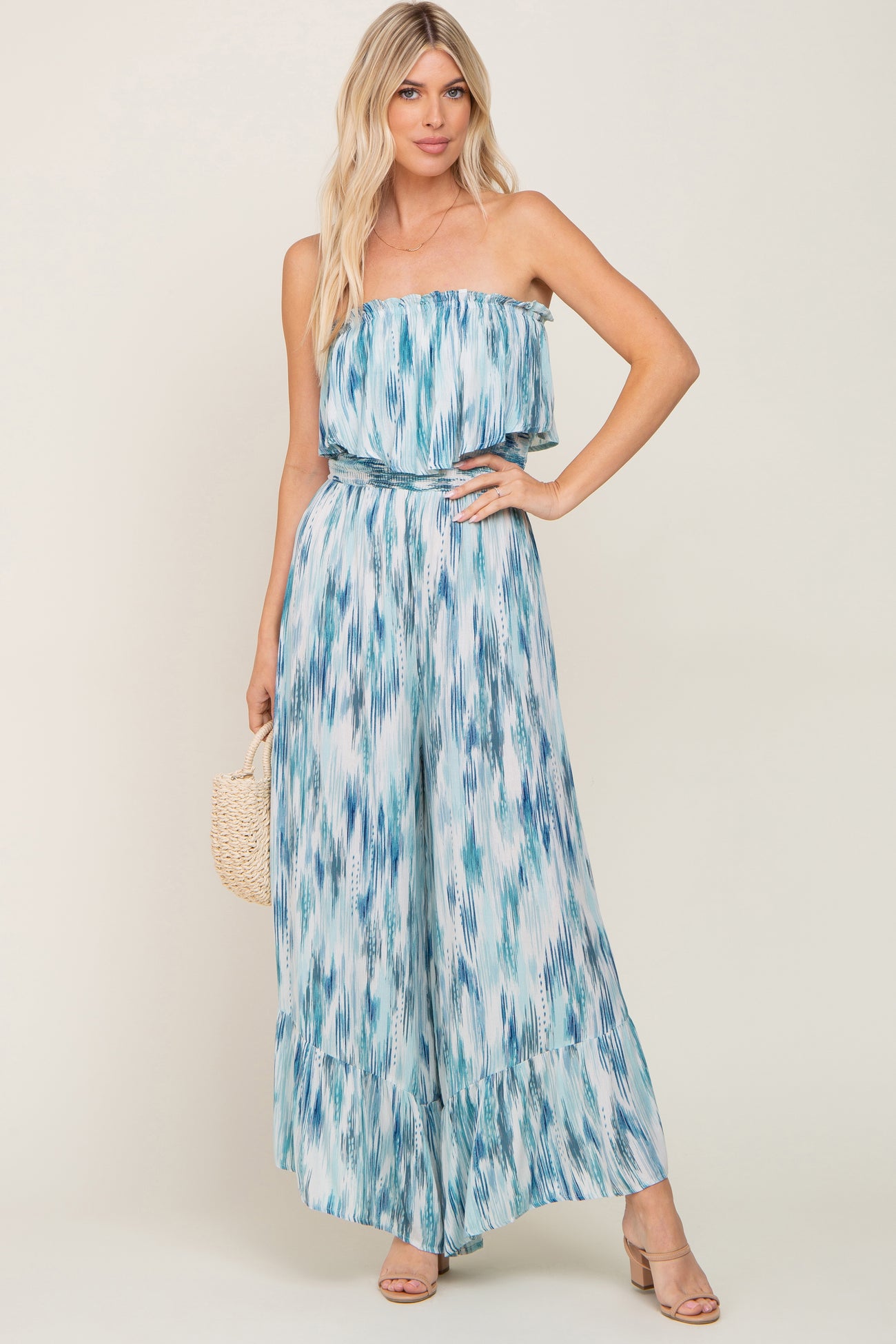Blue Printed Sleeveless Flounce Maternity Jumpsuit