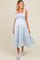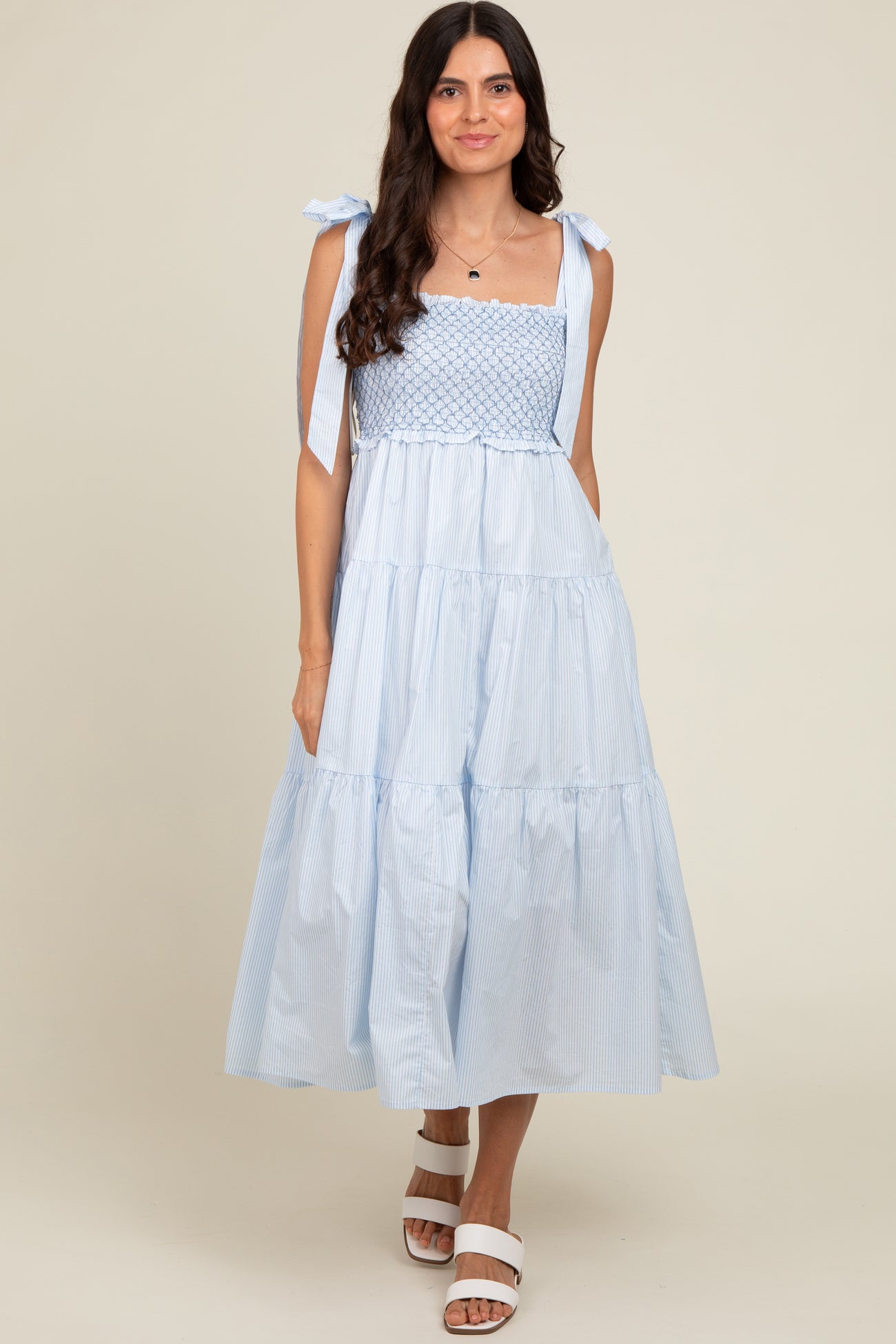 Blue Striped Smocked Tie Strap Maternity Midi Dress
