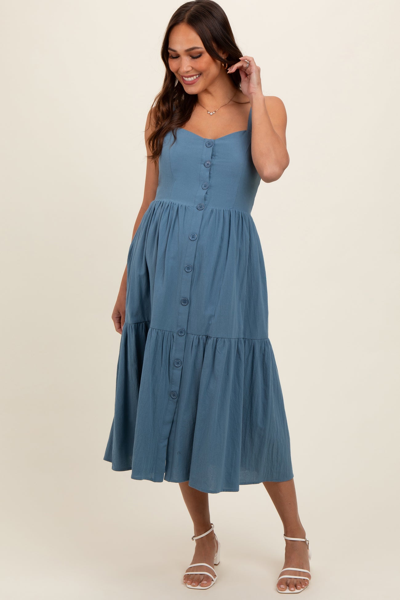 Blue Sweetheart Neck Button Front Tiered Maternity Midi Dress