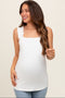 A solid tiered maternity midi dress in a textured material with a smocked bust and puff sleeves. Dress is double lined.