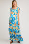 A printed maternity midi dress with a halter back tie neckline and a gathered bottom tier. Dress is lined 3/4 of the way down.