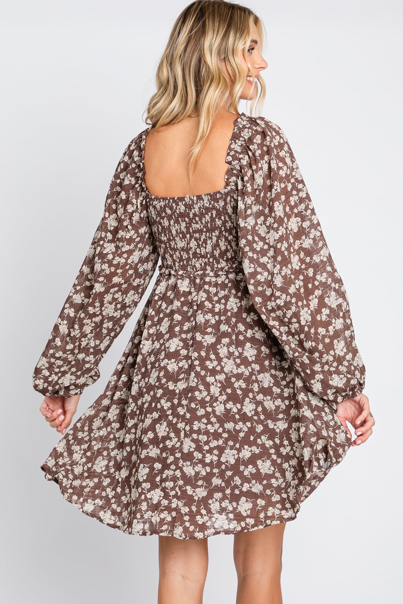 A floral dress that features a v-neckline, a smocked top, long puff sleeves, and a ruffle accent under the bust.