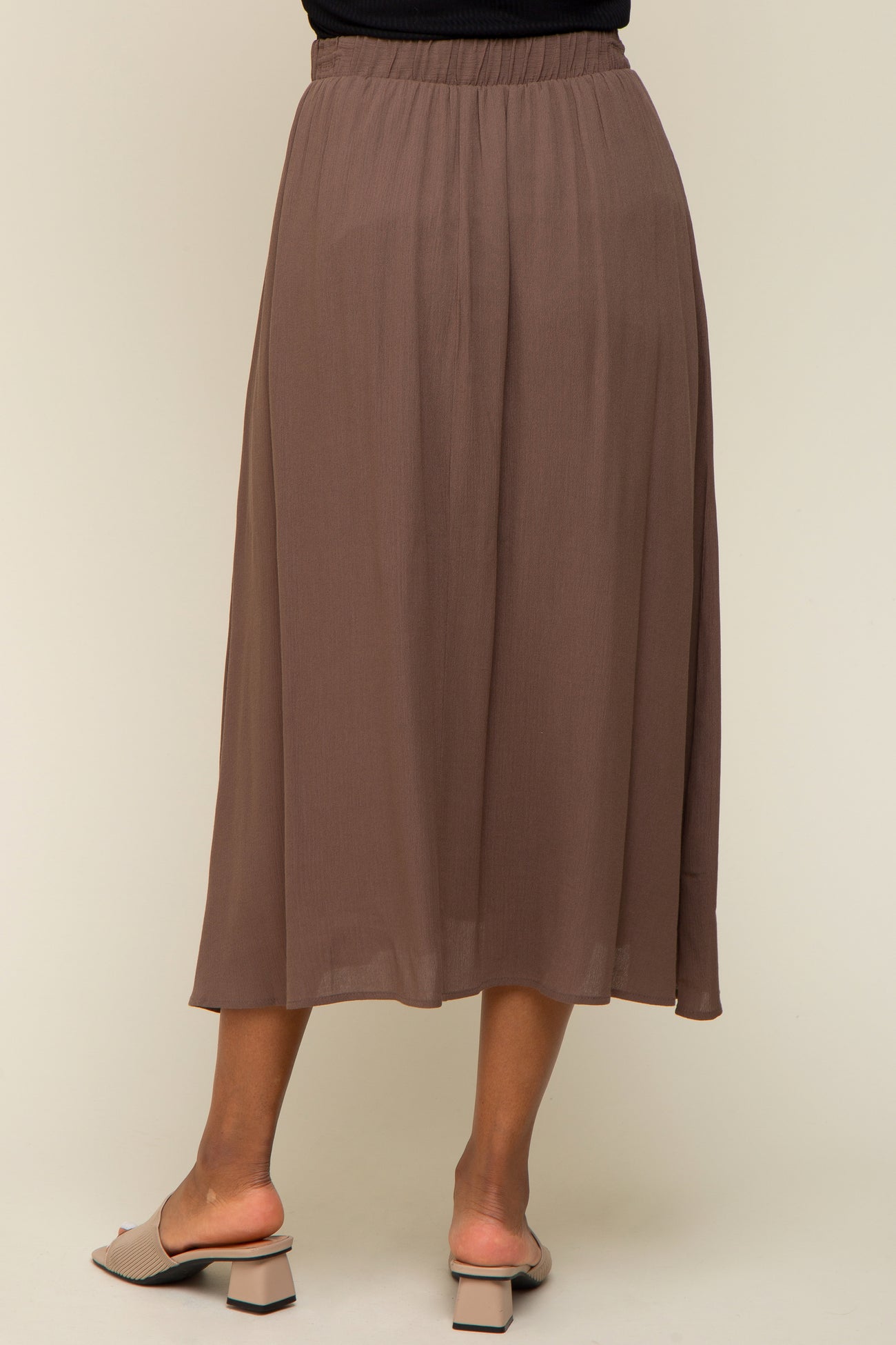 A midi skirt with an elastic back waist and front pleated accents at the waist. Skirt is partially lined.