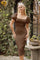 Brown Textured Square Neck Puff Sleeve Midi Dress