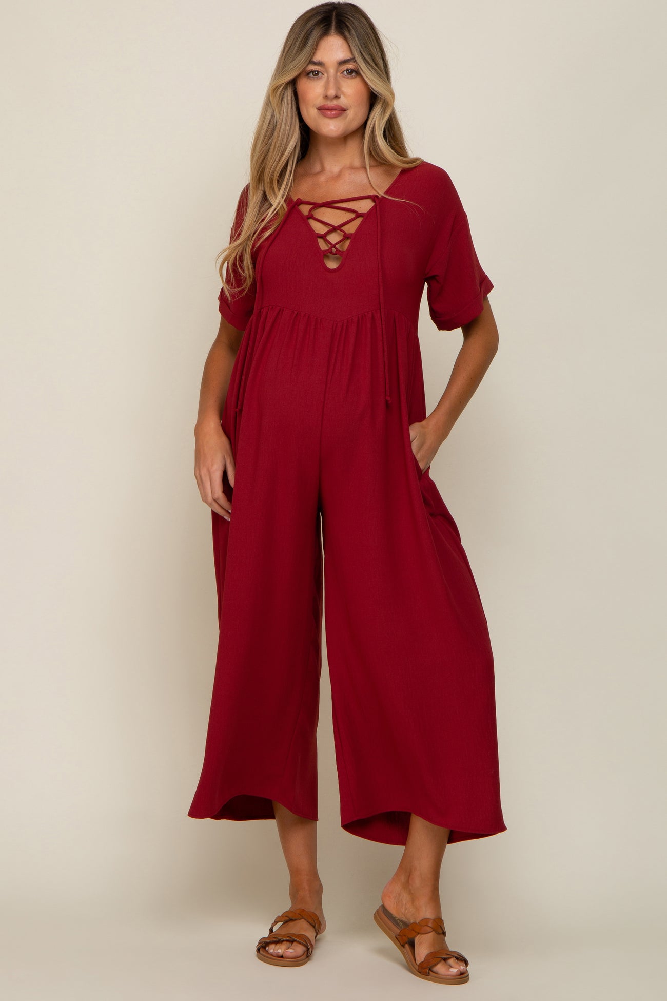 A solid hued cropped maternity jumpsuit featuring wide legs, a crisscross neckline, side pockets and short sleeves.