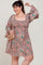 A floral print plus size dress with a v-neckline, ruffle accent shoulders, long cinched sleeves, and a smocked bodice.