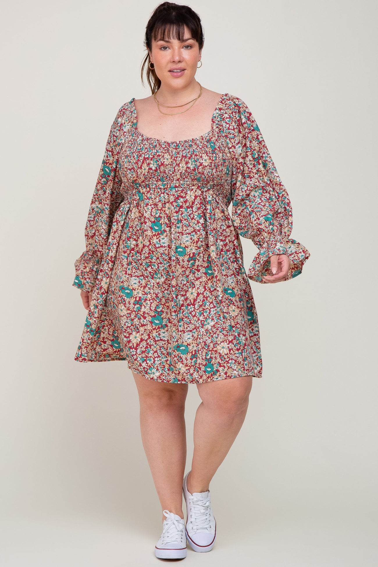 Burgundy Floral Smocked Ruffle Accent Plus Dress