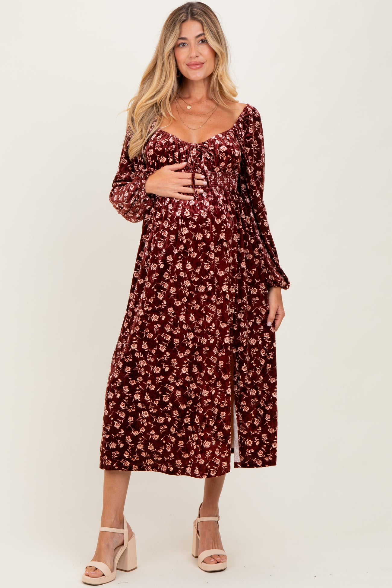 Burgundy Floral Velvet Smocked Maternity Midi Dress