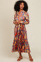 A maternity plus size maxi dress featuring a v-neckline, a front twist, long puff sleeves, side pockets, and a gathered bottom tier. Dress is partially lined.
