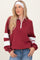Stay cozy and stylish with our Burgundy Half Zip Stripe Sleeve Pullover. This chic top features a rich burgundy color with striking white stripe accents on the sleeves, adding a sporty yet trendy vibe. The half zip front offers adjustable coverage and a modern touch, while the relaxed fit ensures all-day comfort. Crafted from soft, breathable fabric, it’s perfect for layering or wearing solo. Pair it effortlessly with your favorite jeans or leggings for a casual, put-together look. Ideal for chilly days or laid-back weekends, this pullover is a versatile addition to your wardrobe essentials.