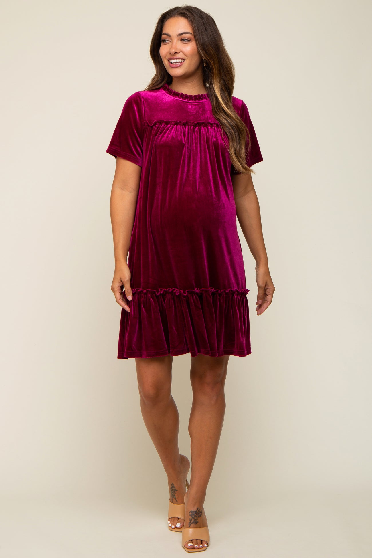 Details A solid velvet maternity dress with ruffle neckline, ruffle trim and button keyhole closure at back. Pocketed. Content + Care