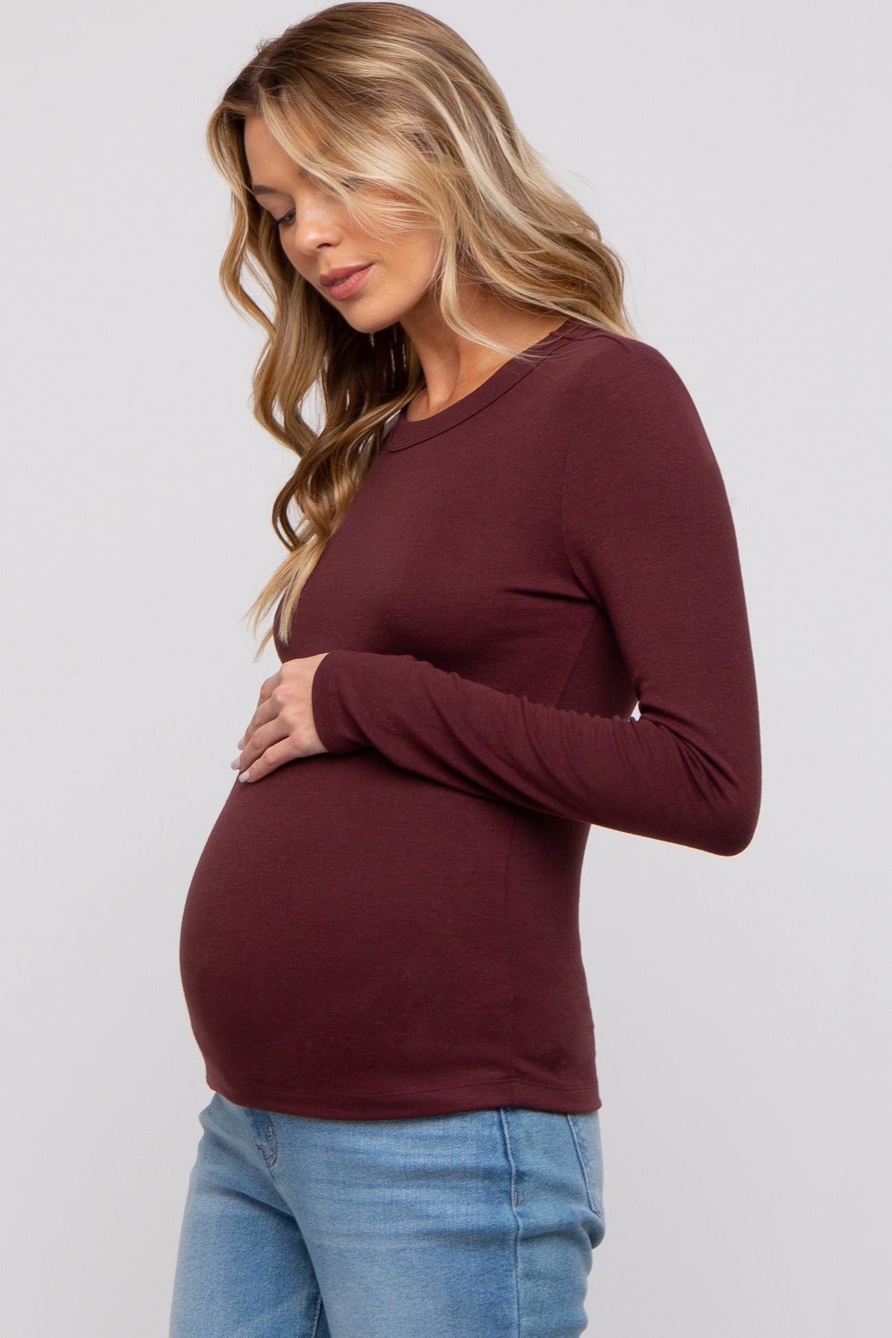 A solid hued maternity top featuring long sleeves and a rounded neckline.