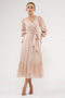 A solid velvet maternity maxi dress with v-neckline, flutter short sleeves, tie detail and zipper closure in back. Dress is double lined.