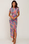A velvet maternity maxi dress featuring short sleeves, a tiered body, back smocking and a square neckline.