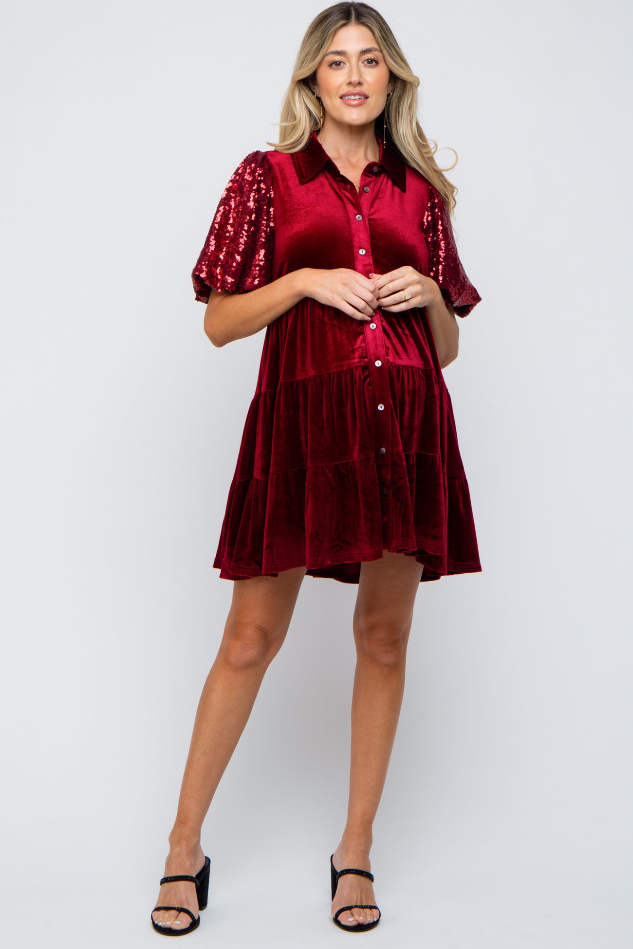 A velvet maternity dress featuring a collared neckline, sequin short sleeves, a button down front and a tiered skirt.