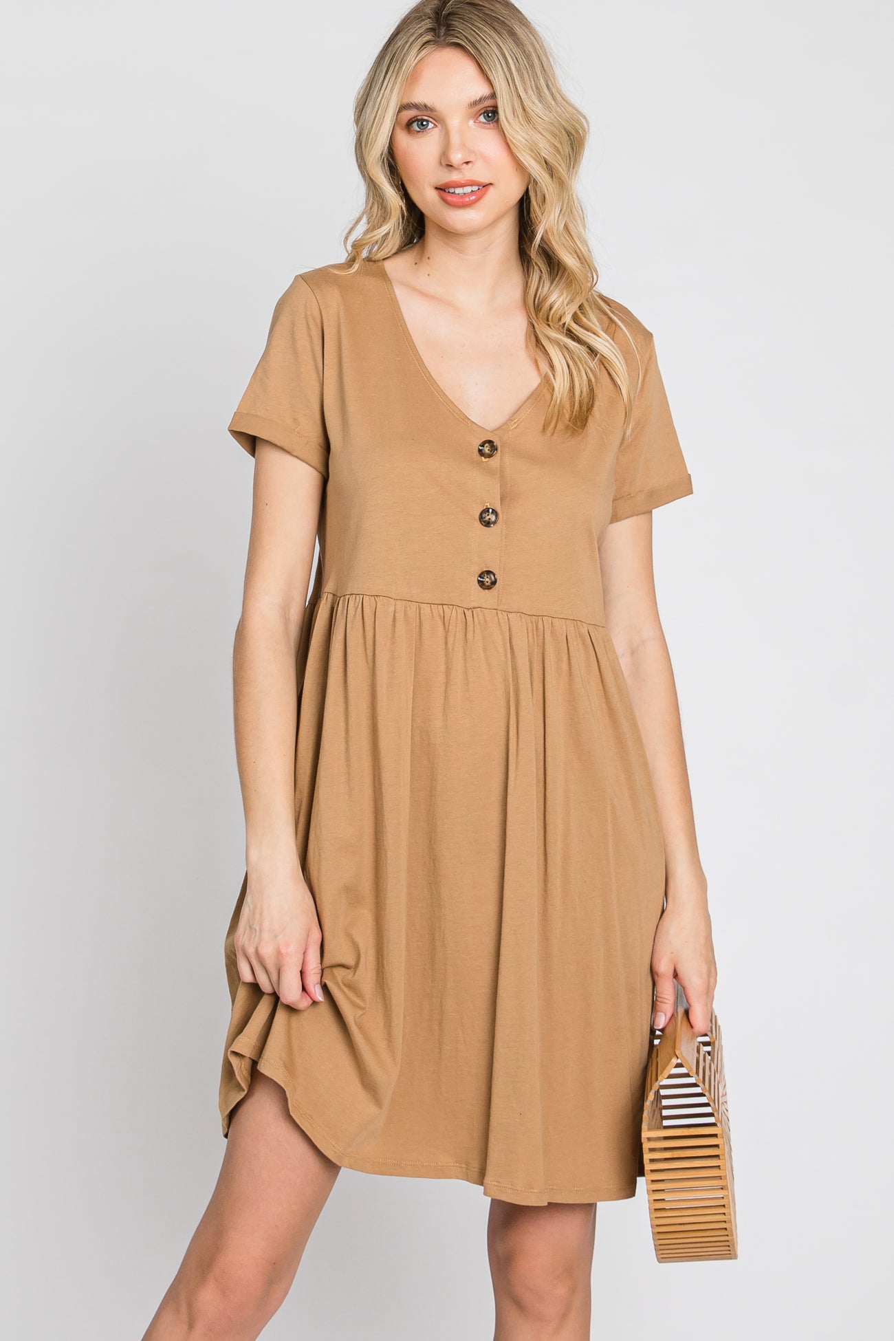 A solid short maternity dress with a button up front and rolled cuff sleeves.