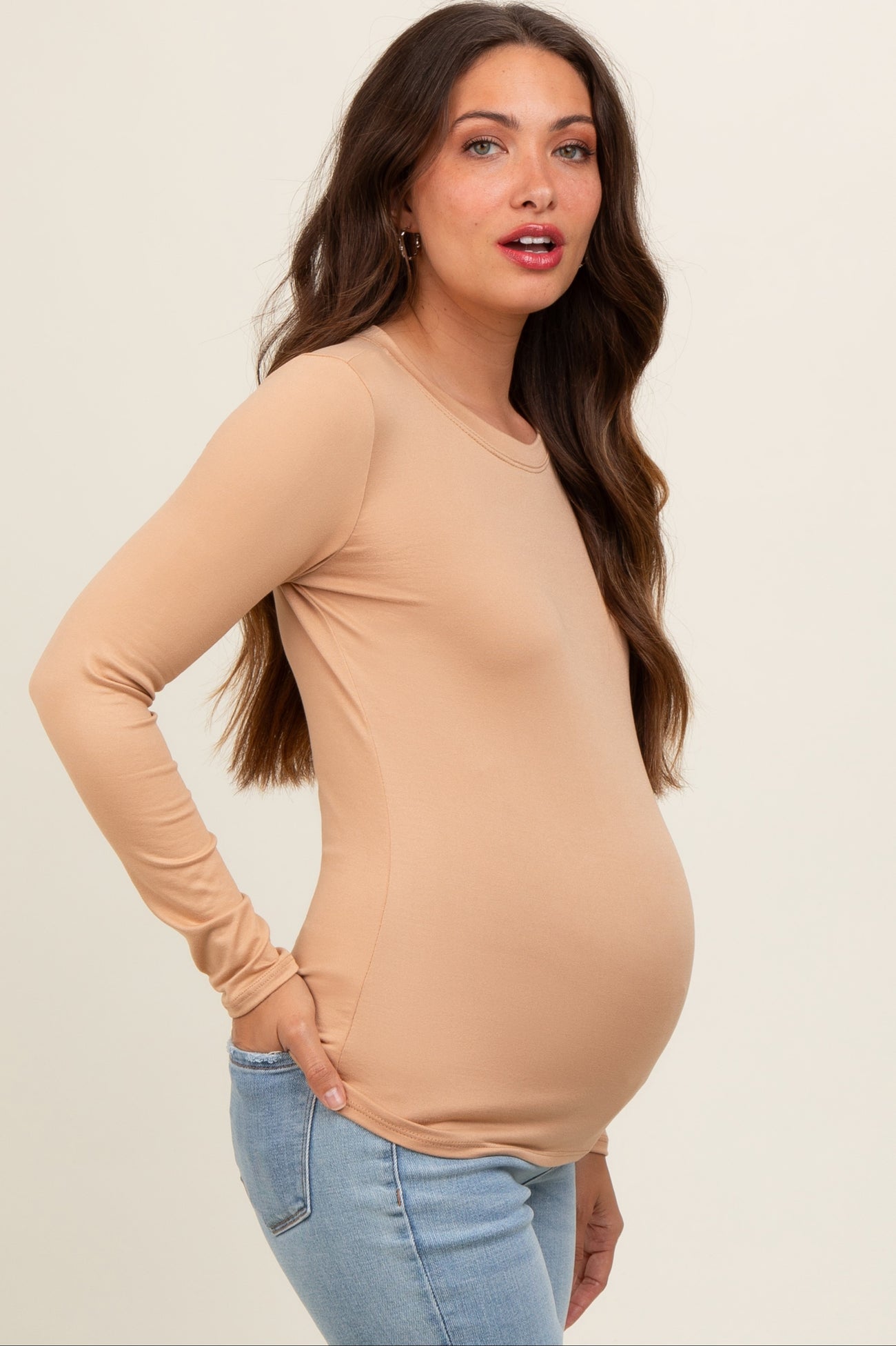 Camel Knit Long Sleeve Round Hem Maternity Top