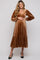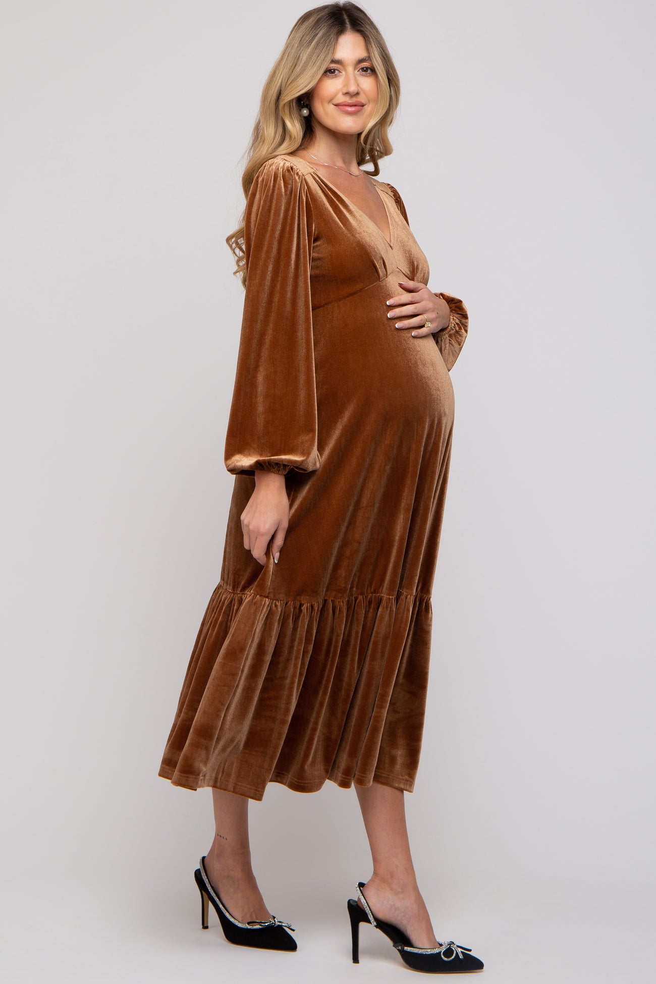 Camel V-Neck Ruffle Hem Velvet Maternity Midi Dress