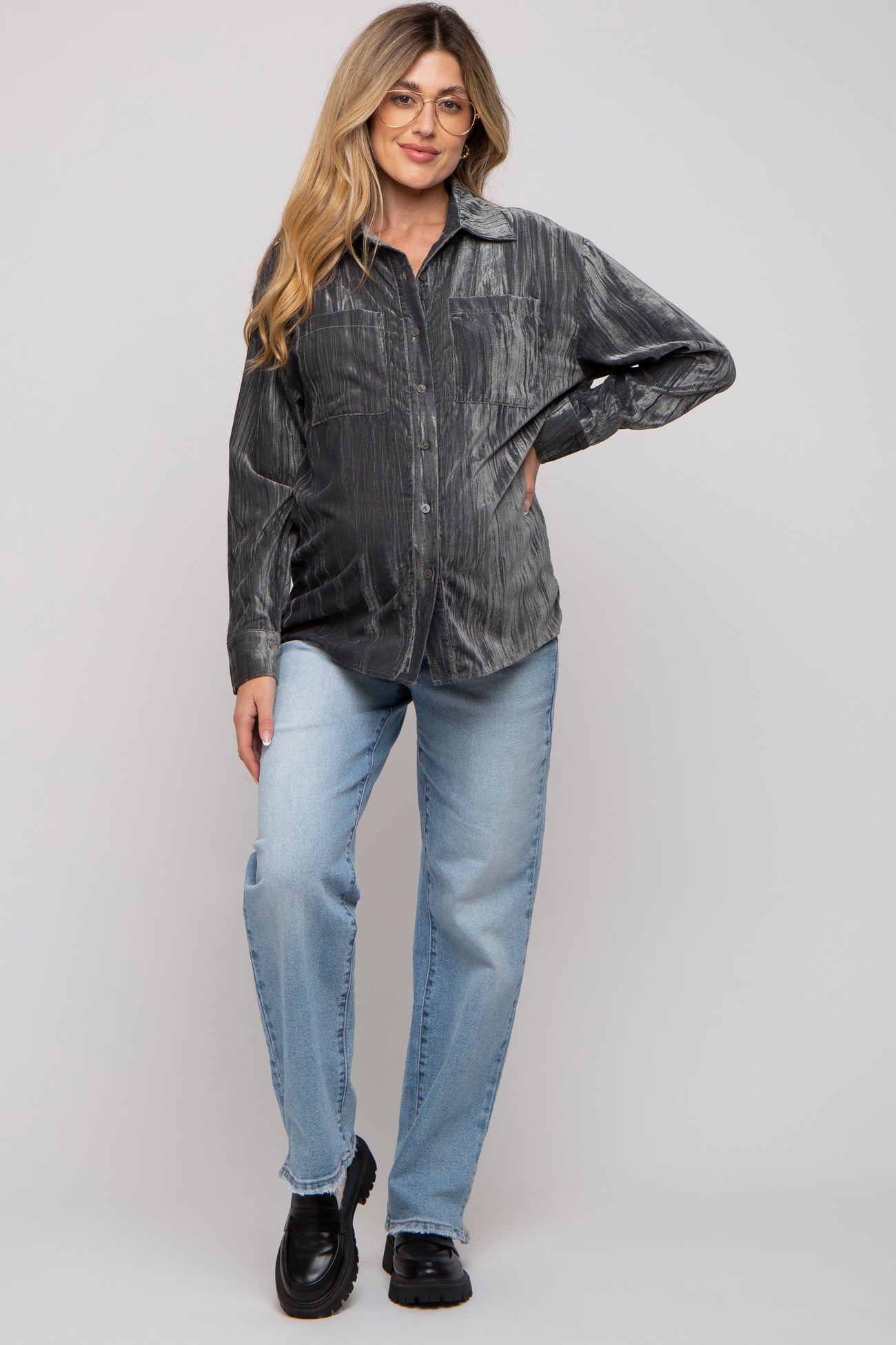 A pleated velvet maternity top featuring a collared neckline, a button up front, two front pockets and long sleeves.