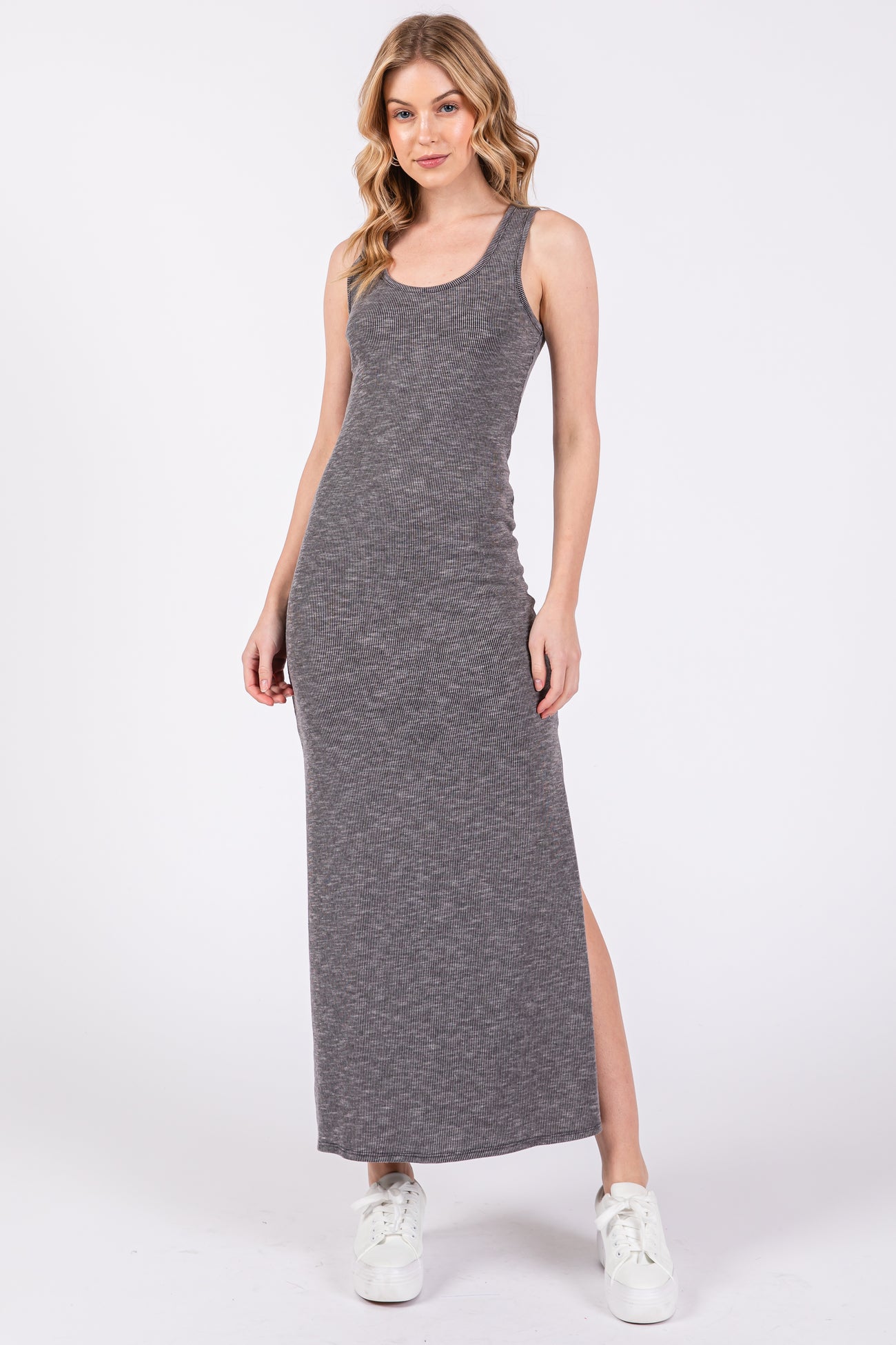 Charcoal Ribbed Sleeveless Side Slit Maternity Midi Dress