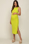 A sleeveless ribbed maternity maxi dress featuring side slits and a rounded neckline.