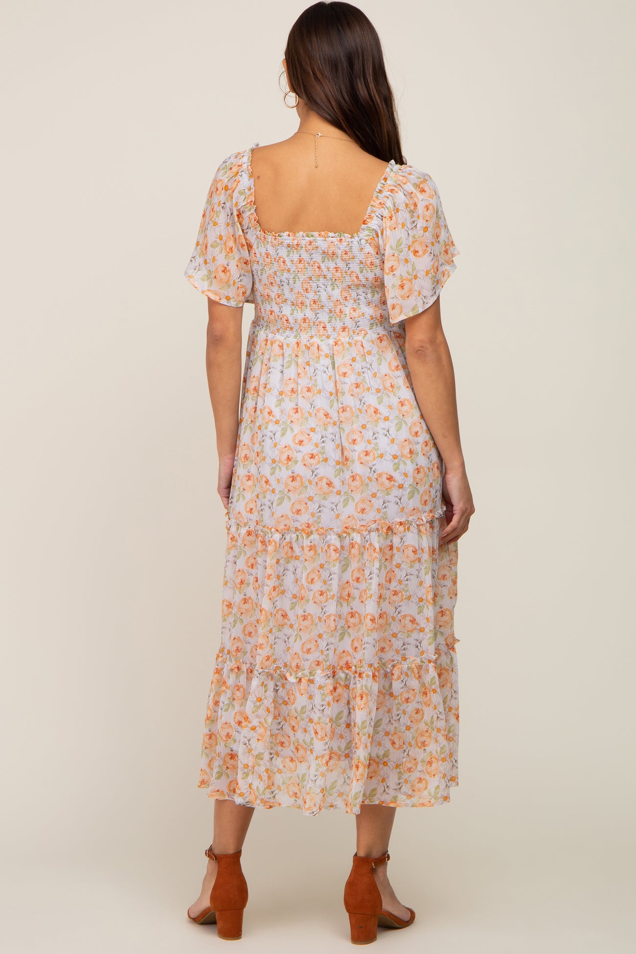 Coral Floral Chiffon Tiered Maternity Midi Dress