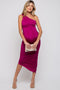 A pair of straight legged maternity jeans featuring distressed knees, 5 pockets, and an elastic belly band.