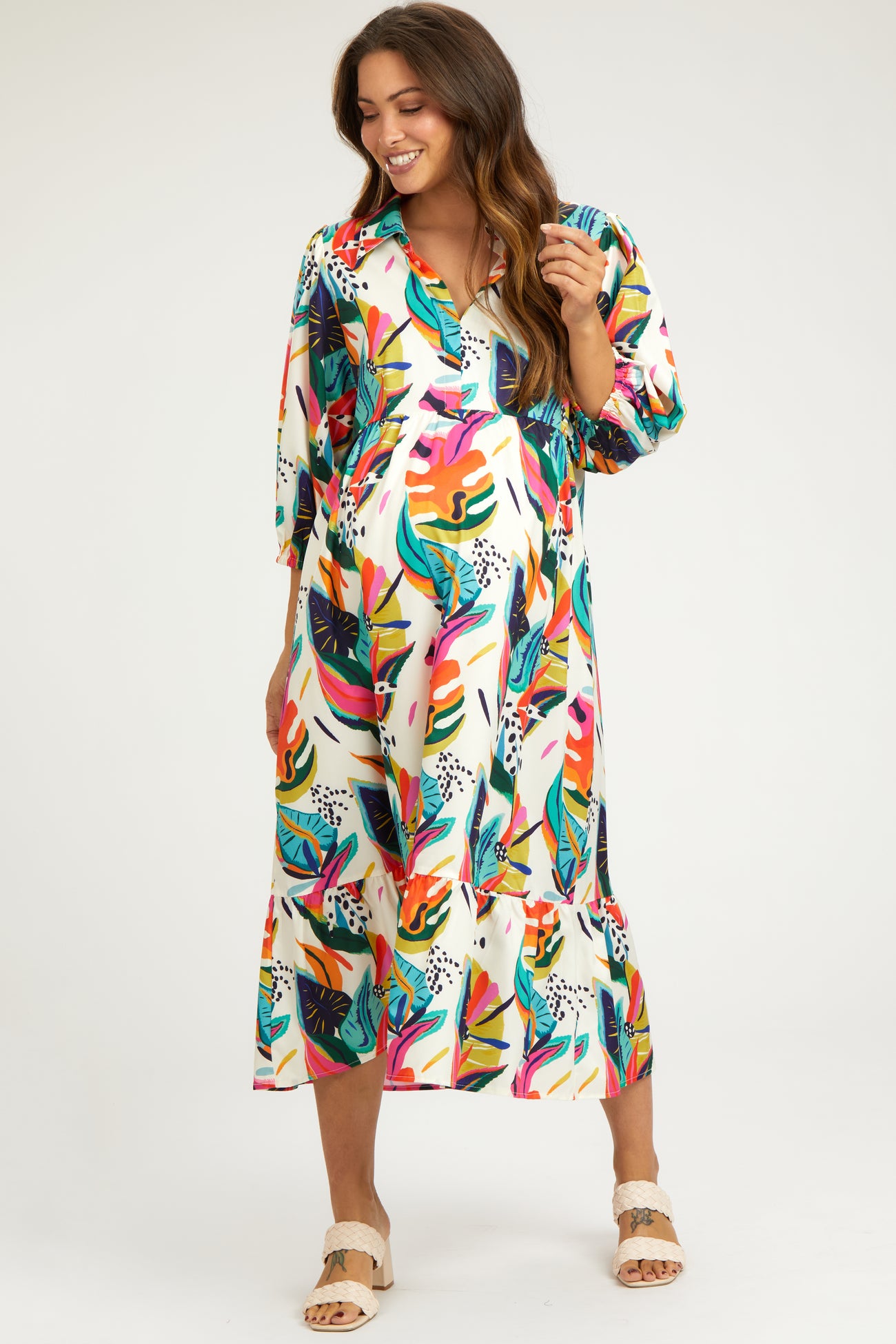 A leaf print maternity dress with a split v-neckline, half-length puff sleeves, a collar, and a gathered bottom tier.
